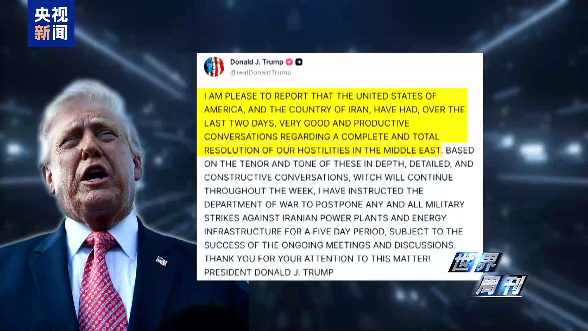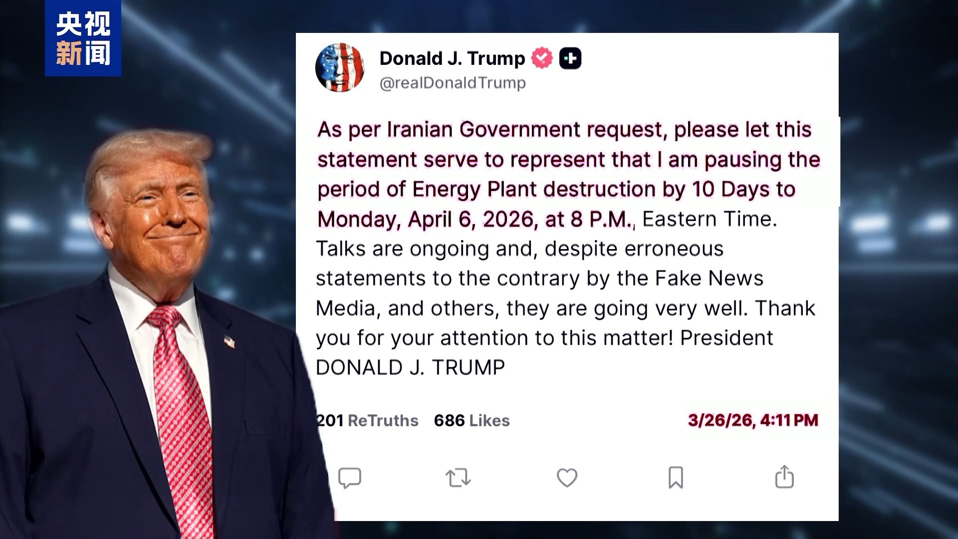 3月26日,特朗普再度在“真实社交”发帖称,应伊朗政府请求,将暂停对伊朗能源设施的打击行动10天。