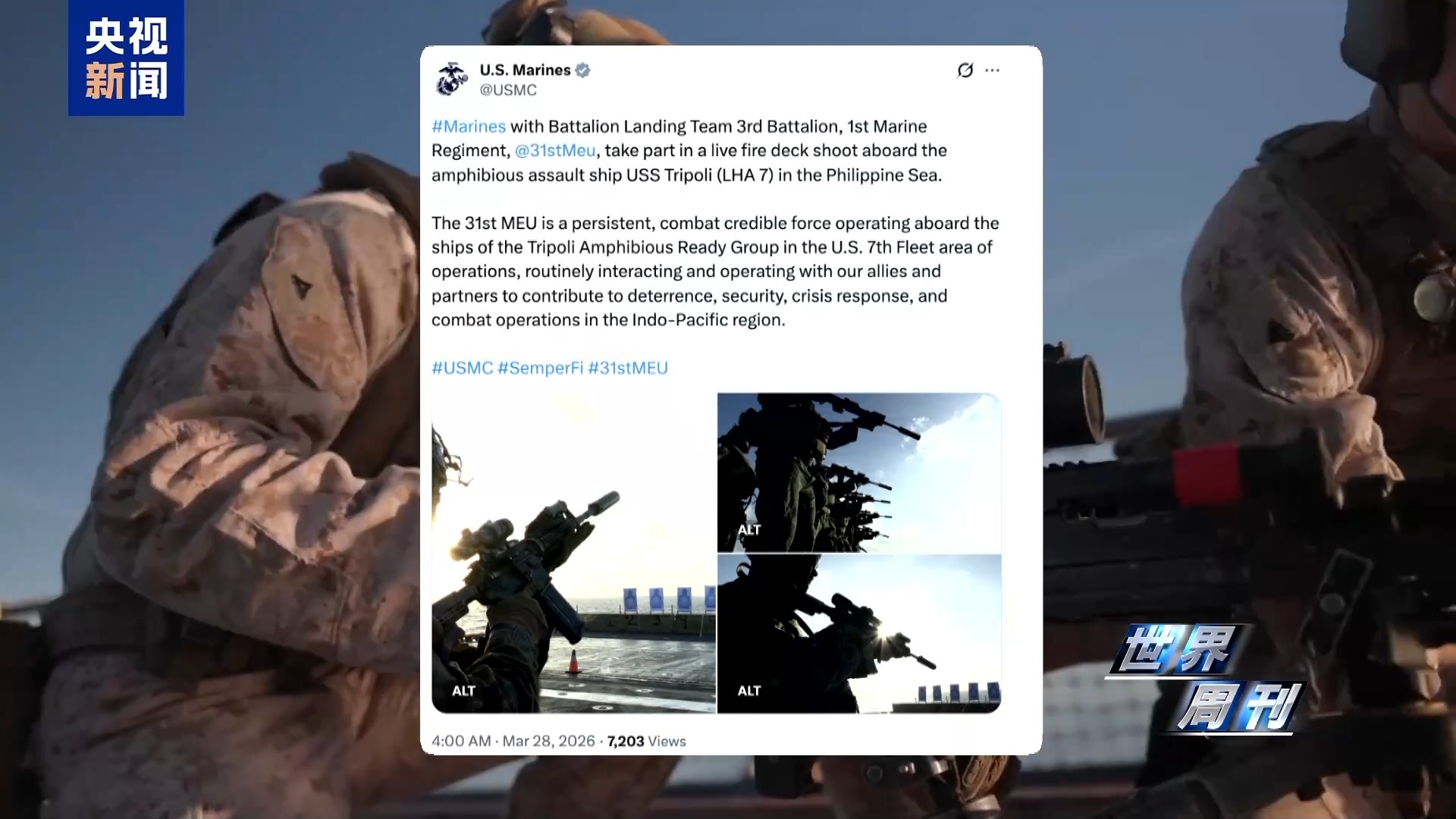 3月28日,美国海军陆战队在社交媒体X上公布了第31海军陆战队远征队在“的黎波里”号两栖攻击舰甲板上实弹射击演习的照片。此时,“的黎波里”号已经抵达波斯湾海域。