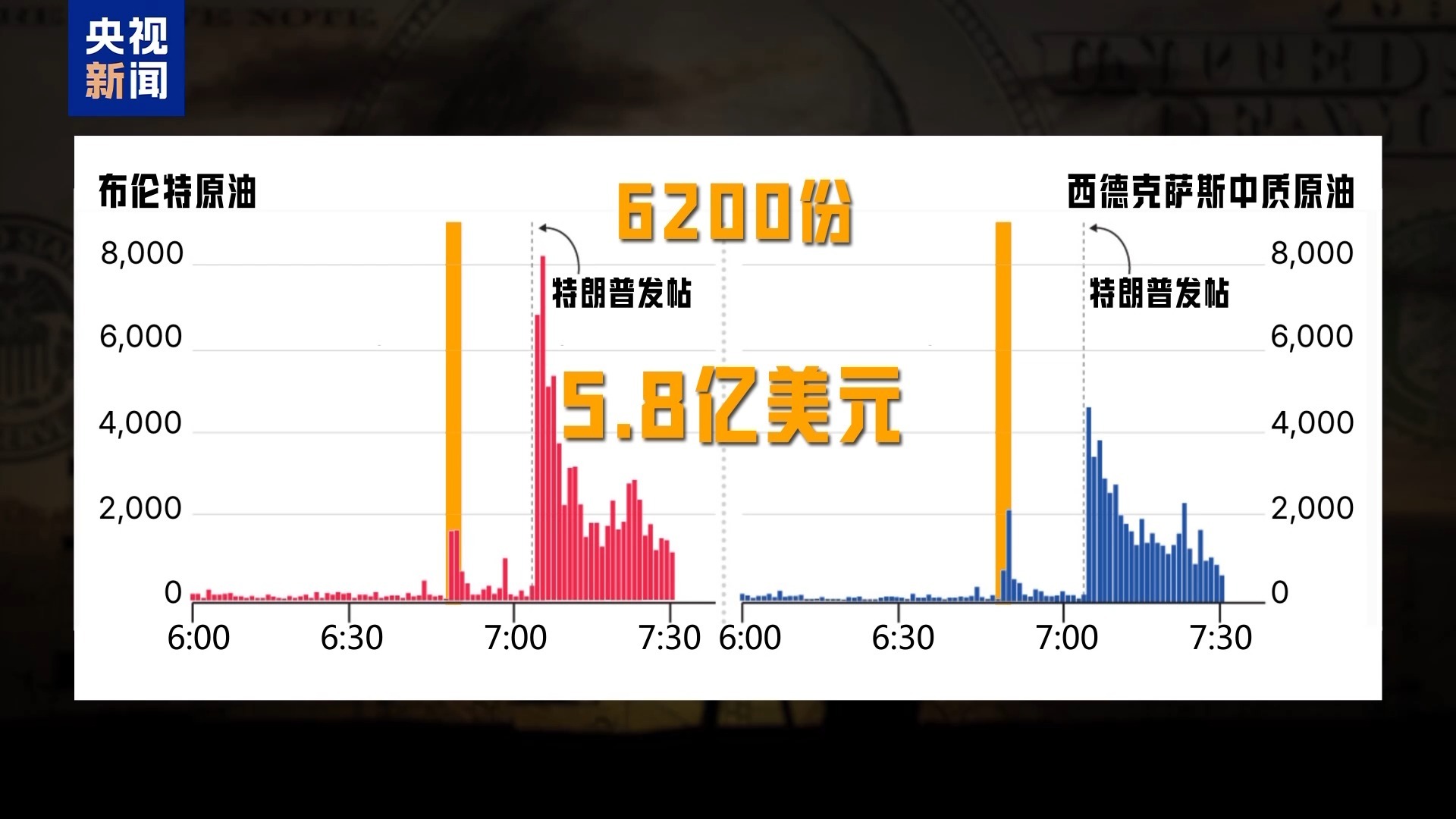 英国《金融时报》指出,就在特朗普发帖15分钟前,约有6200份布伦特原油和西德克萨斯中质原油期货合约易手,名义价值高达5.8亿美元,几乎同时,标普500指数期货成交量也大幅上升。